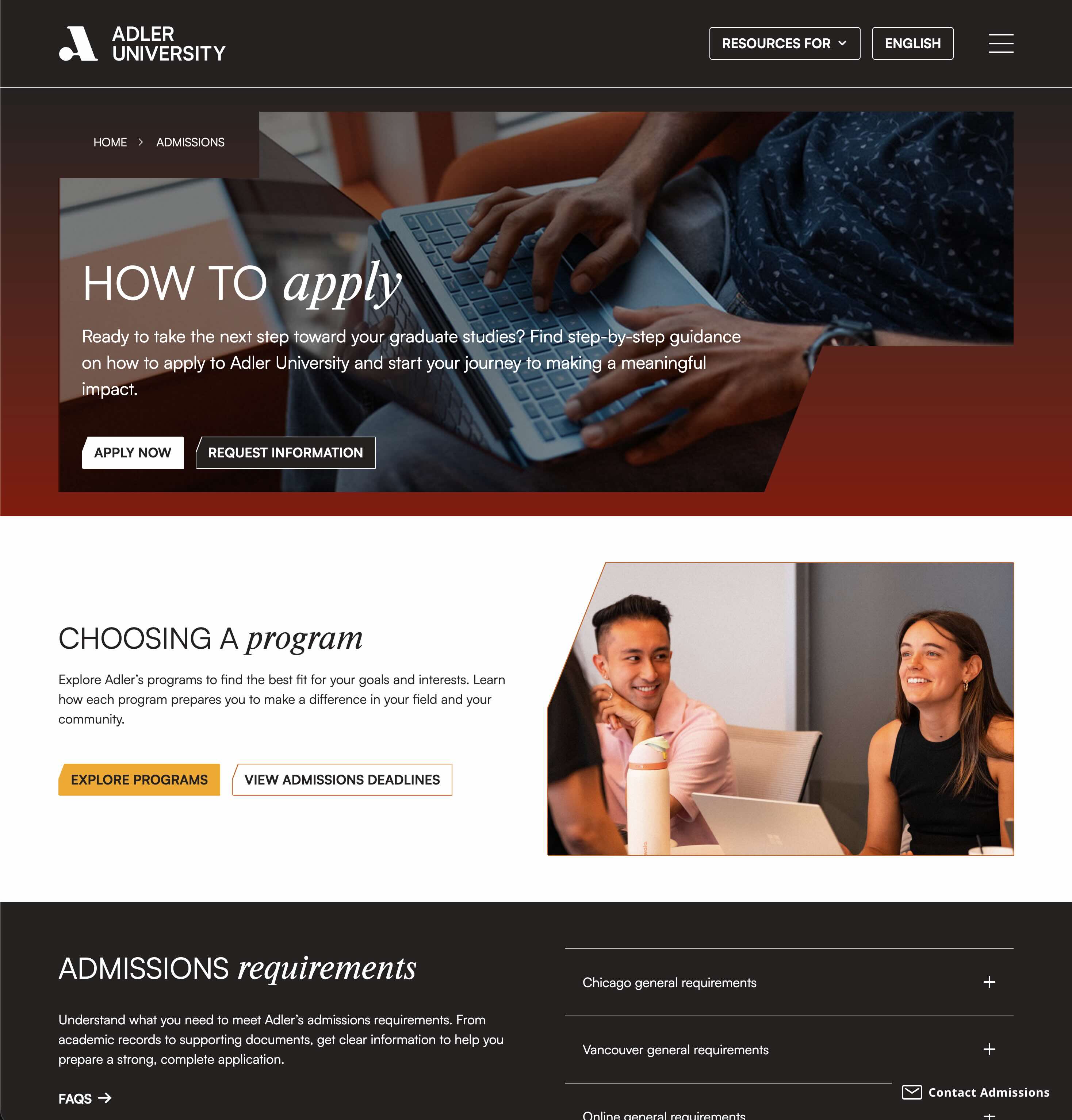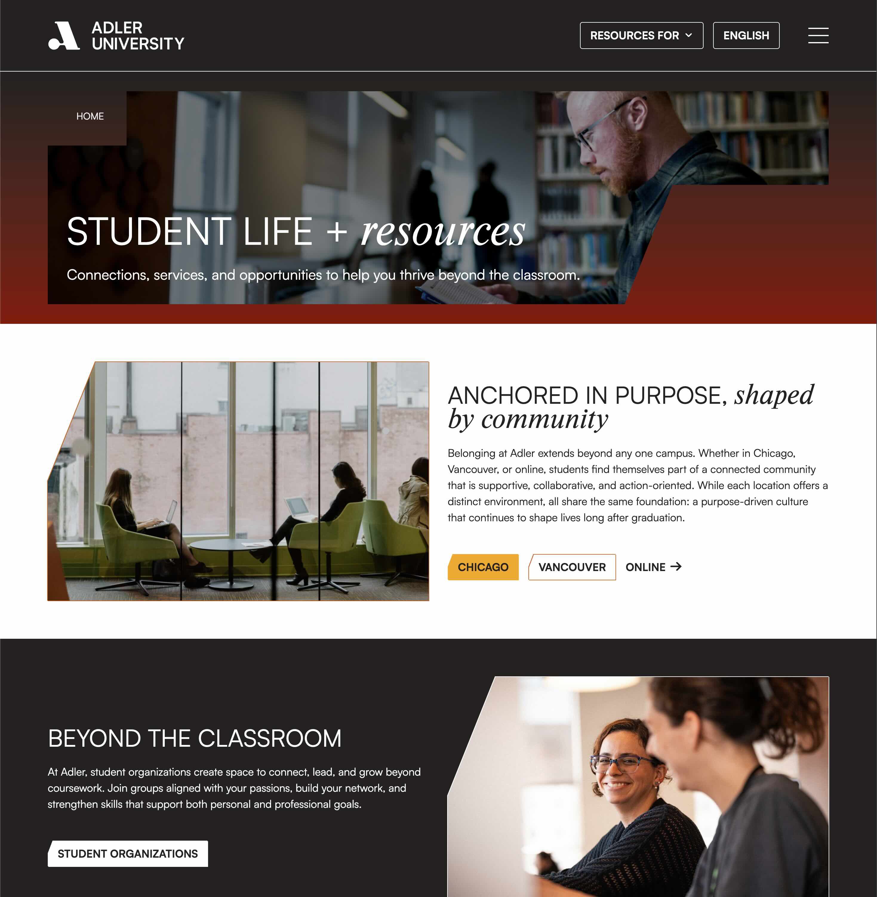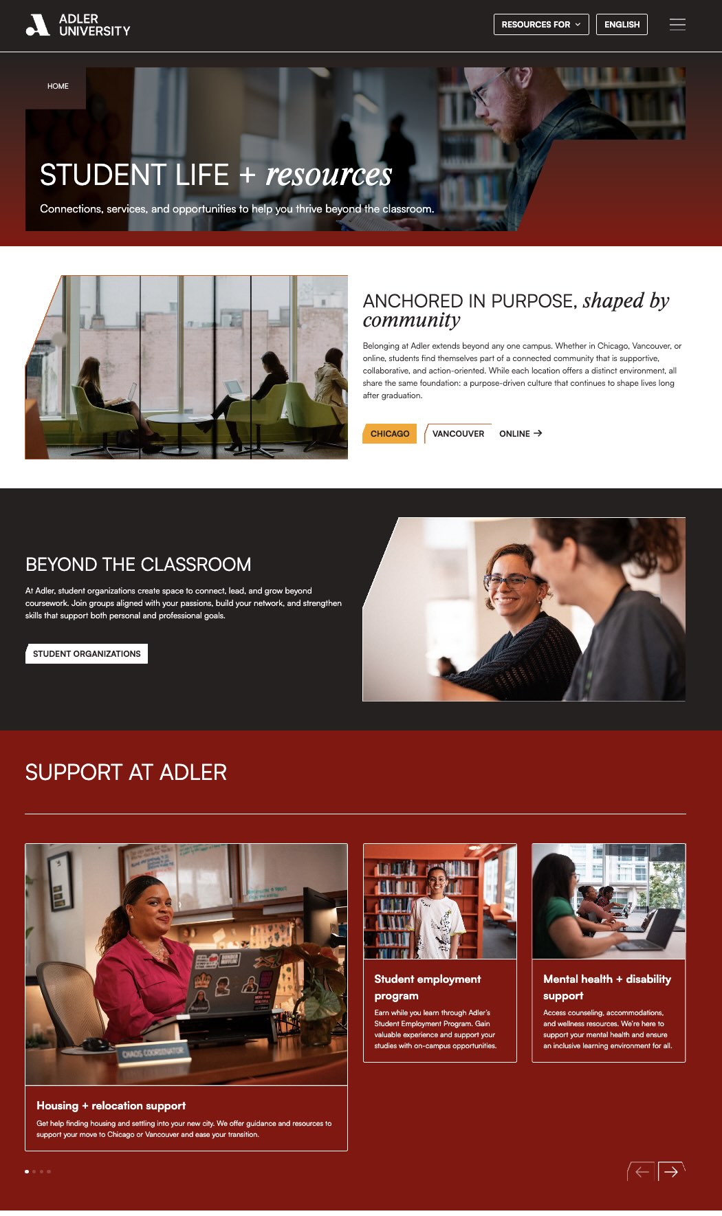Adler operates across multiple campuses with overlapping programs and differing financial structures, modalities, and leadership dynamics. Prospective students faced identity ambiguity, campus differentiation friction, and credential complexity. Internally, cross-campus alignment required a shared decision framework rather than siloed marketing efforts.