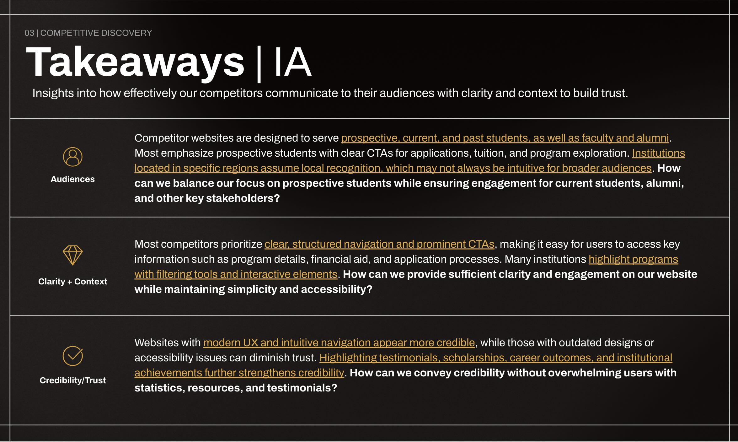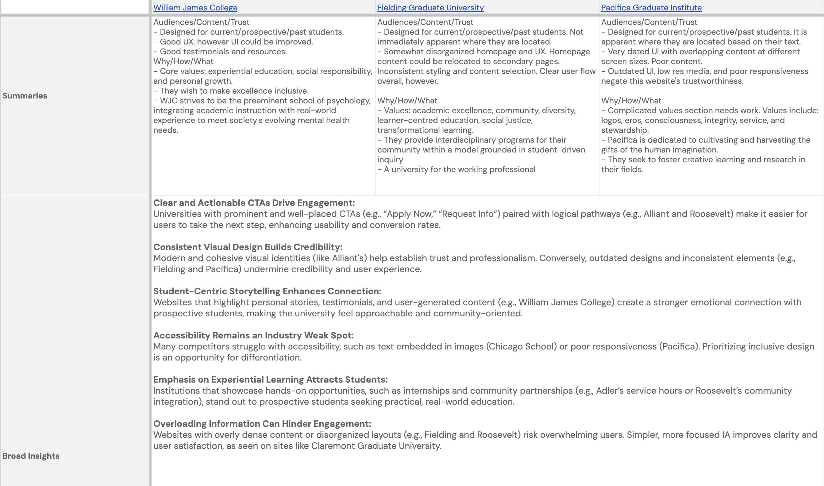 I identified how prospective students evaluate graduate programs—location, pacing, credential, tuition, and outcomes—through analytics review, competitive analysis, and stakeholder interviews.